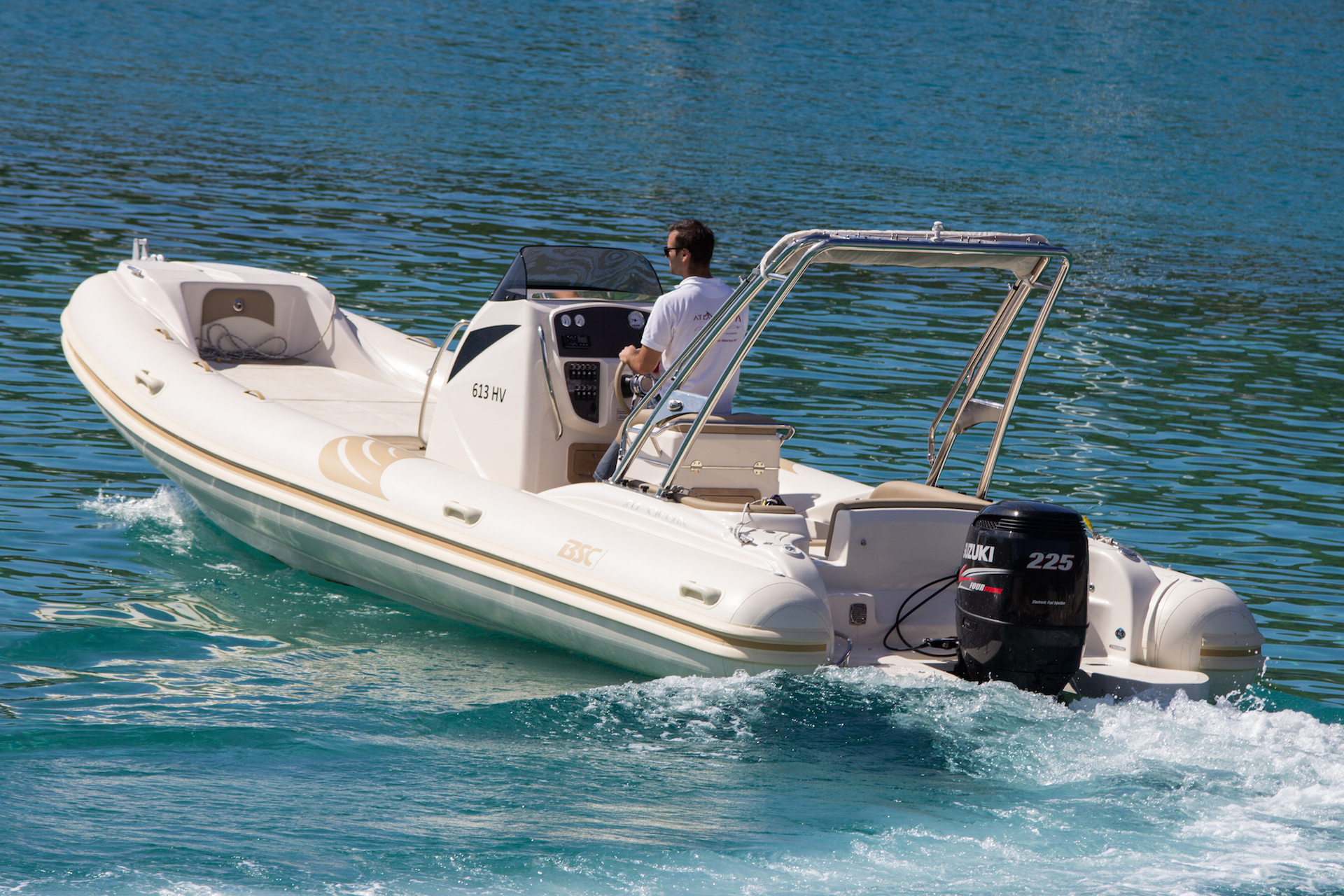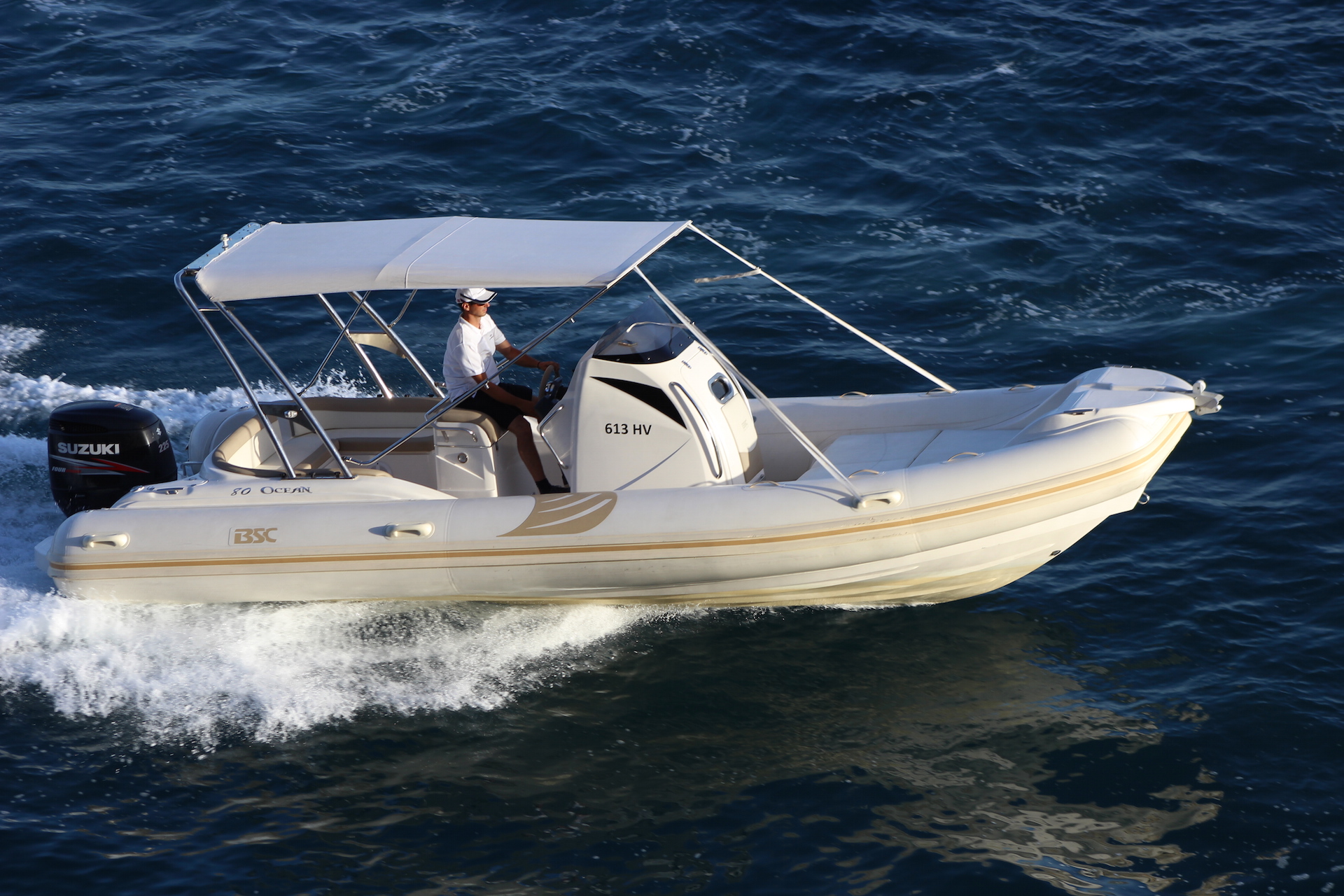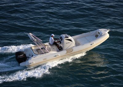 BSC 80 Ocean with engine Suzuki 225 HP is the largest RIB in our offer. 12 persons can be accommodated on this boat. BSC 80 Ocean has cabin shower, an electric toilet in the console cabin, bimini sun-cover, large sundeck in the front and possibility of sundeck in the back because of the U shaped bench which can also be turned into a sundeck.