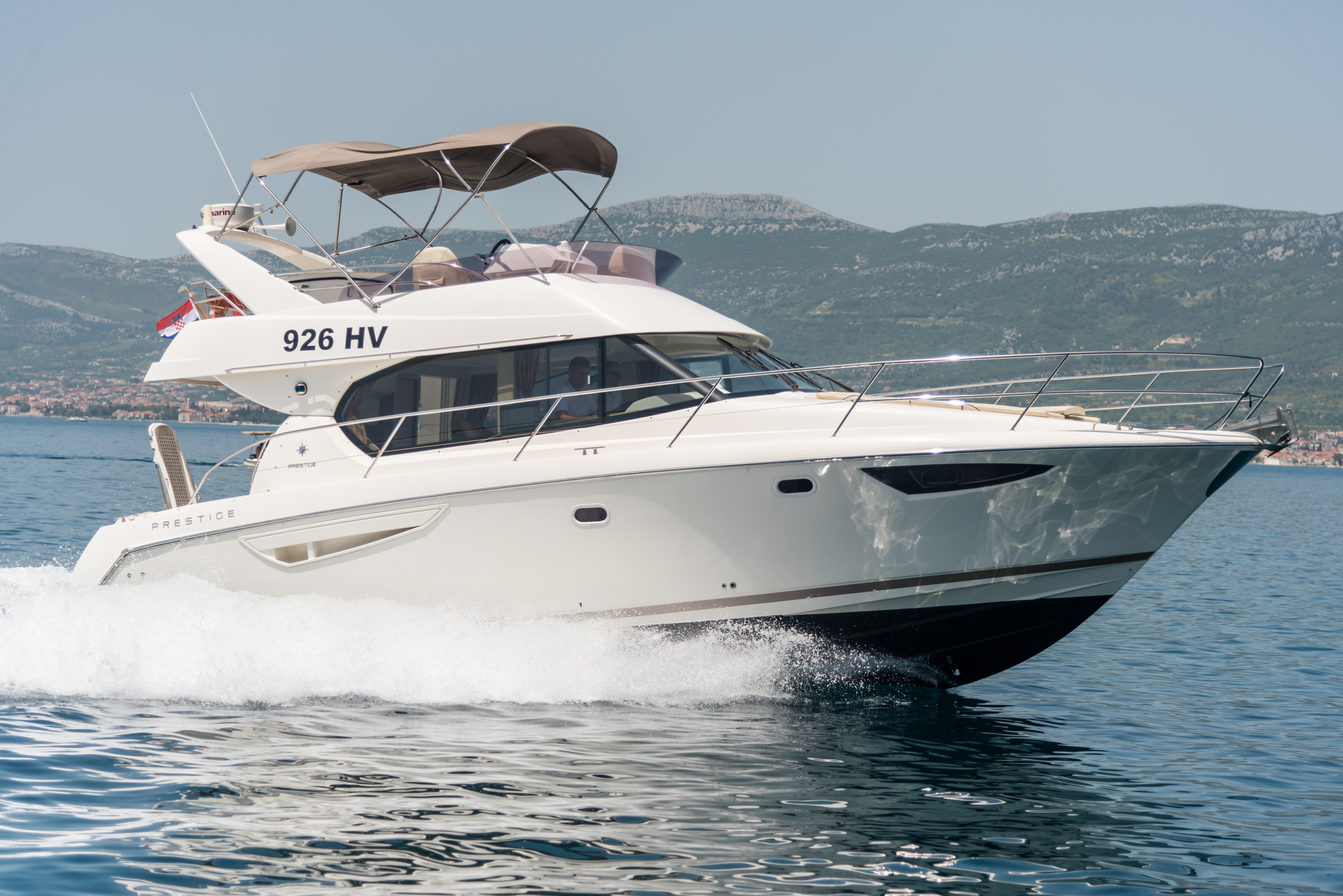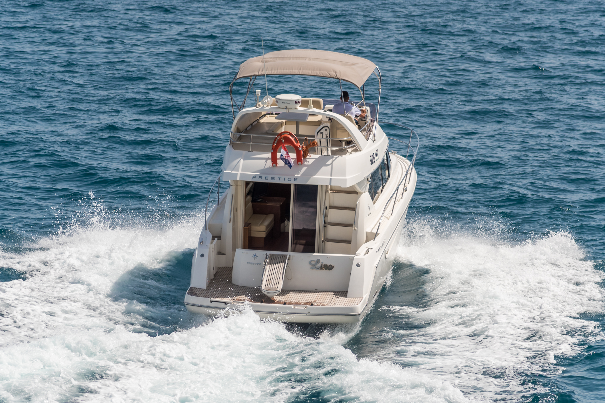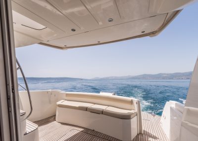 Jeanneau Prestige 400 can drive up to 10 people, larger family or group of friends. This boat is equipped with swimming ladder, swimming platform, sunbed, flybridge, electric toilet, 2 cabins, shower, towels, kitchen, fridge, freezer, fire extinguisher, first aid kit, deck shower, speakers and radio/CD, WiFi…