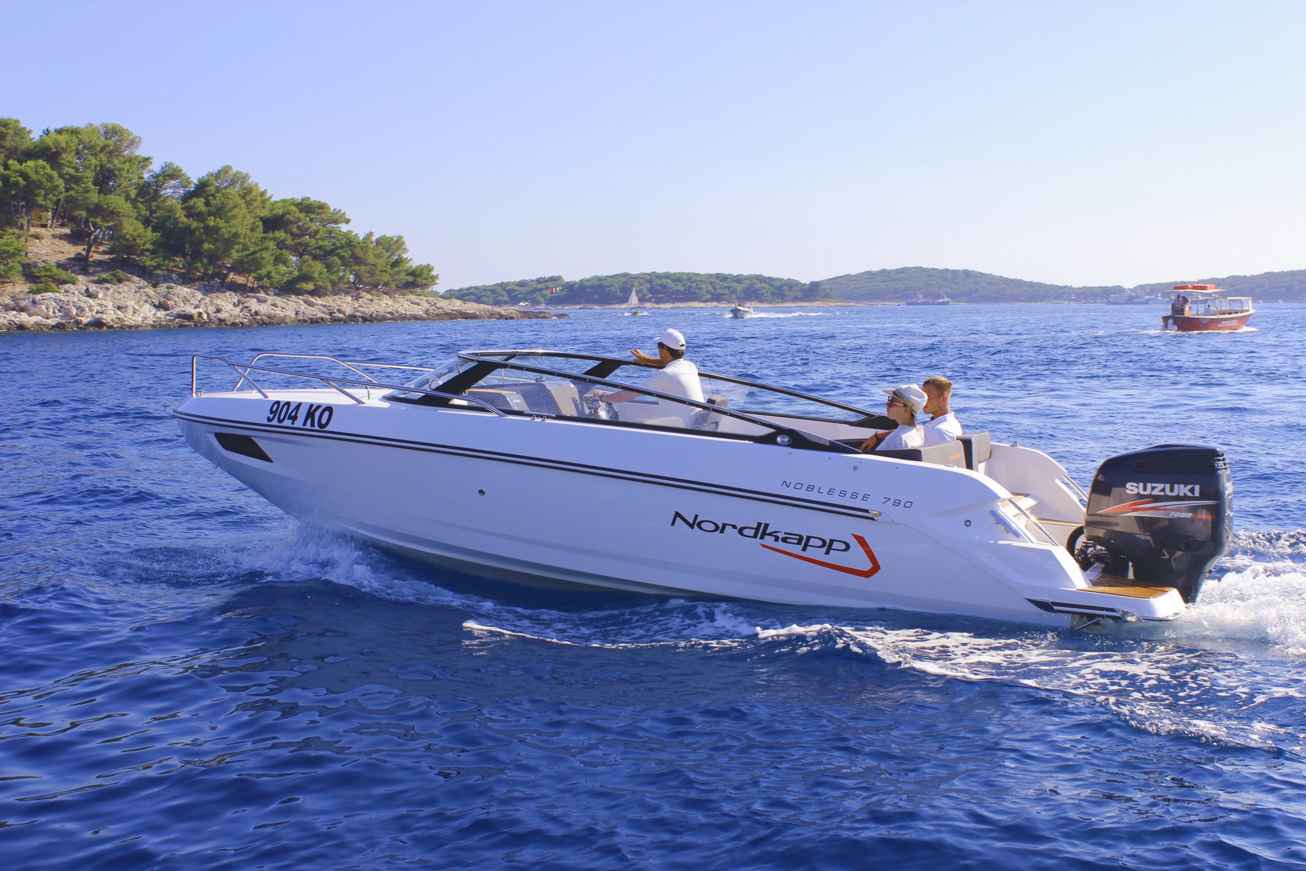 Nordkapp Noblesse 830 has Suzuki 300 HP engine, large windscreen, cabin, seating for 10 people, electric toilet. Cabin has enough room for 2 persons sleeping. Nordkapp Noblesse 830 has full camper cover which protects it from sun, rain and wind, but is can also be partially opened for aft passengers to enjoy the sun. There are ladder and shower on aft platforms.